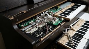 電子ピアノの内部構造は、木と弦でできているアコースティックピアノとは全く異なり、パソコンと同じような精密な緑色の電子基板、無数の細いケーブル(フラットケーブル)、そして複雑に組み合わさったプラスチック製の鍵盤アクション機構で成り立っています。
