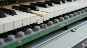 電子ピアノの内部には、鍵盤の動きを正確に感知するためのデリケートなシリコン製のゴム接点が敷き詰められています。長年同じピアノを弾き続けていると、このセンサー部分に微細なホコリが付着してしまったり、ゴム自体が長年の摩擦による経年劣化で摩耗し、接触不良を起こしてしまうことがあるんですね。
