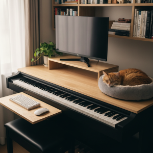 例えば、有名国内家具メーカーとコラボレーションしたモデルなどは、天然木のオーク材やウォルナット材を使用しており、蓋を閉めると完全にフラットな美しい木目のテーブルに早変わりします。これなら、DIYで天板を自作する手間もありませんし、メーカーが「上に物を置いて使うこと」を前提に設計しているため、耐荷重や耐久性の面でも安心感が段違いです。リビングの真ん中に置いても全く違和感がなく、来客時には素敵なサイドテーブルや飾り棚としても活躍してくれます。お値段は少し張りますが、毎日の作業効率とインテリアとしての満足度、そして楽器としての確かな品質を考えれば、投資する価値は十分にある選択肢だと思いますよ。楽器店で実物を見ると、その美しさにきっと驚くはずです。
