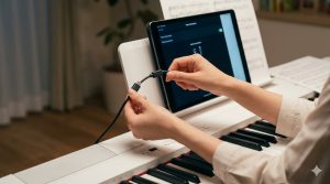 最近の電子ピアノにはBluetooth MIDI機能が内蔵されているモデルも増えてきました。この場合はケーブルなしで、タブレットの設定画面からBluetoothでペアリングするだけで接続完了です。もし内蔵されていない電子ピアノでも、市販のワイヤレスMIDIアダプタを端子に挿せば無線化できるので、足元をすっきりさせたい方におすすめです。