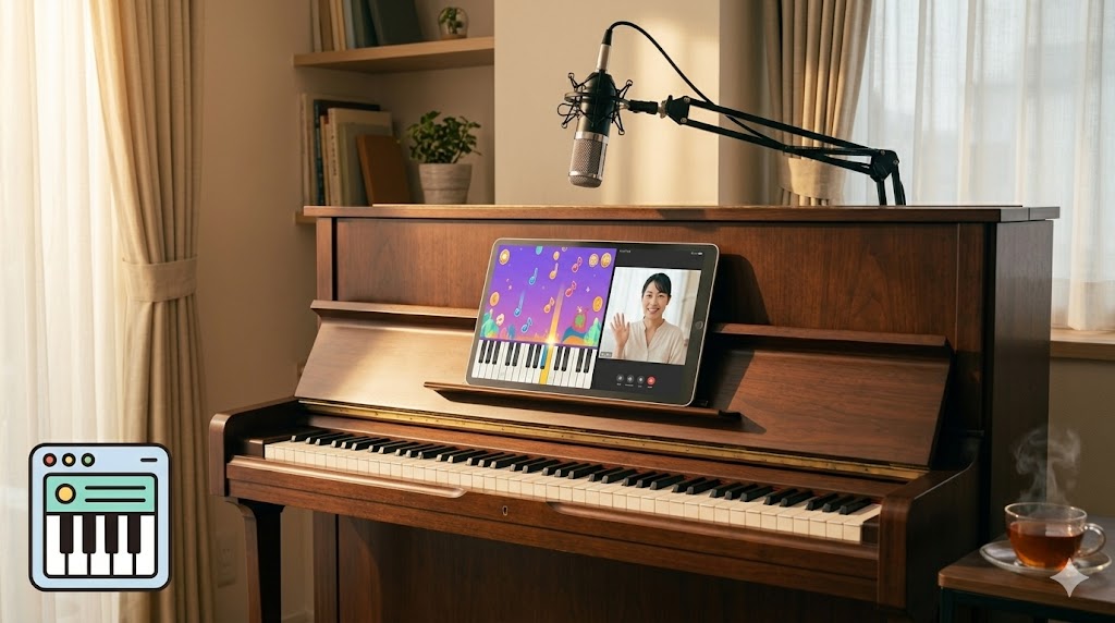 でも、いざ始めようとすると「無料のおすすめアプリはどれ?」「電子ピアノとタブレットの接続やセッティング方法は?」「アコースティックピアノでも使えるの?」と、準備の段階で迷ってしまうことも。また、鍵盤の前に置くためのスタンド選びや、Zoomなどを活用したオンラインレッスンの受け方を知りたいという声もよく聞きます。